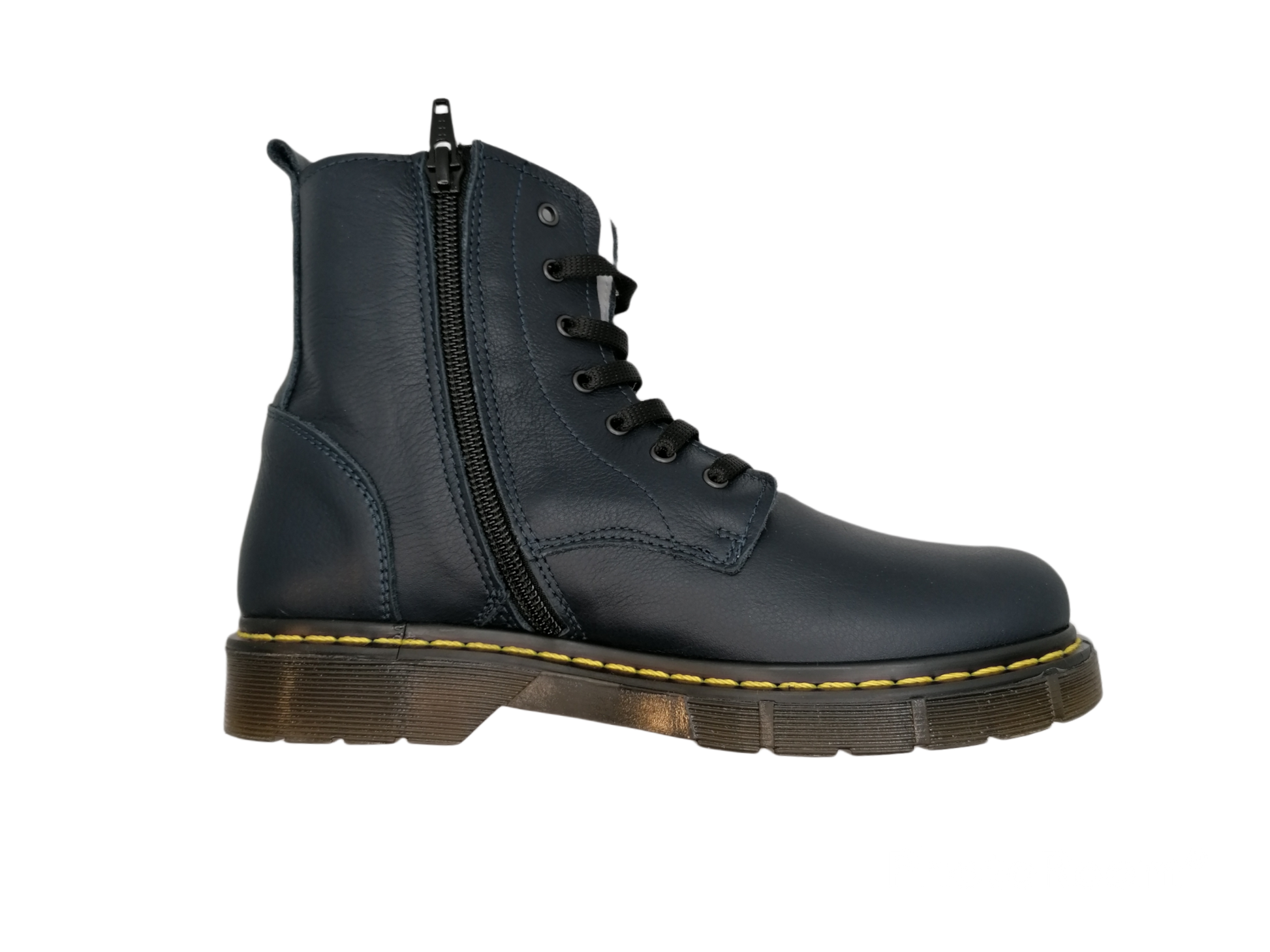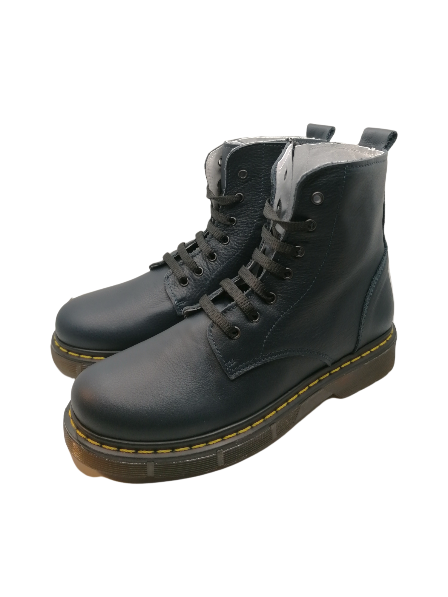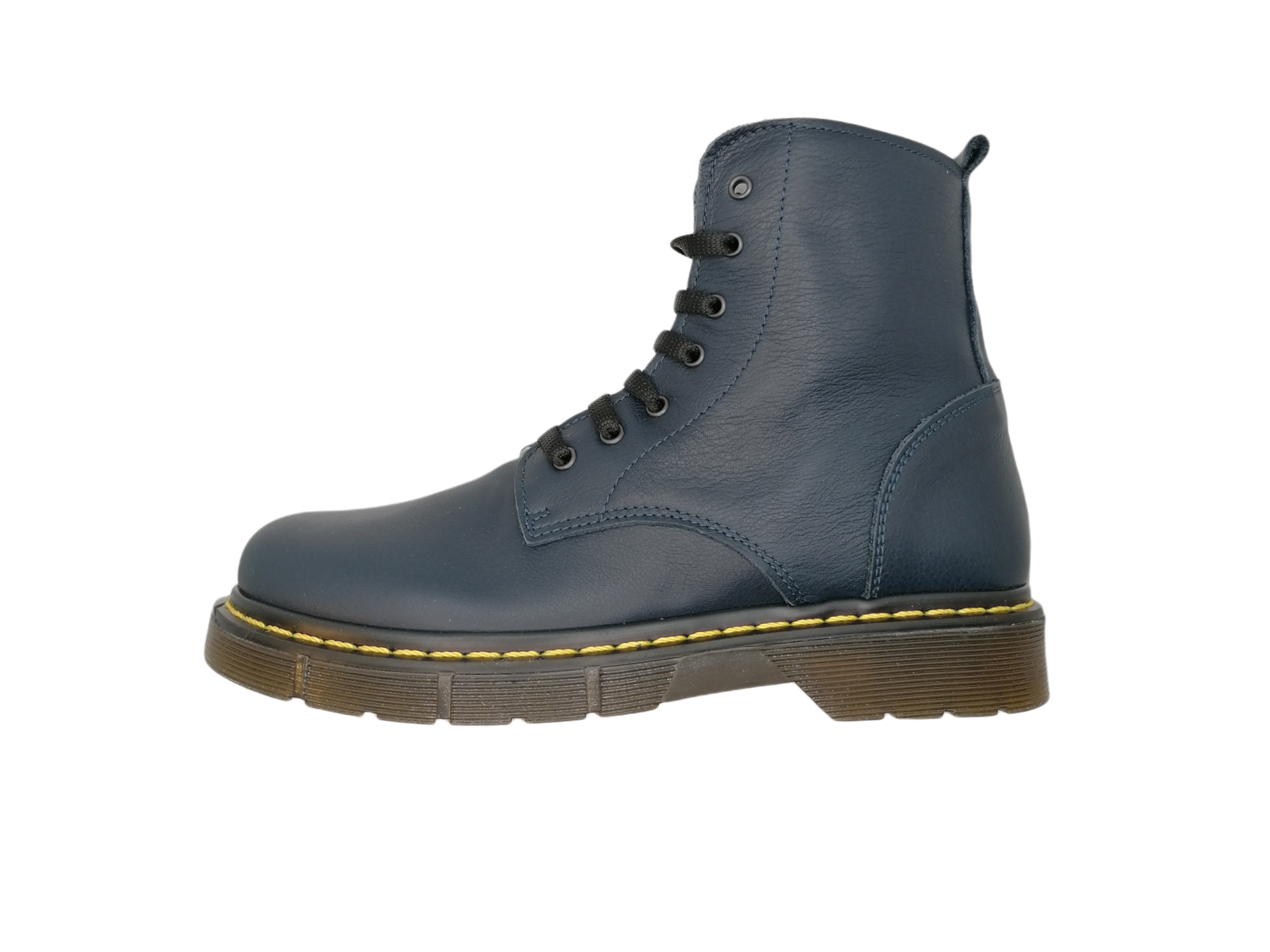 Anfibi in vera pelle blu con suola carrarmato in gomma.