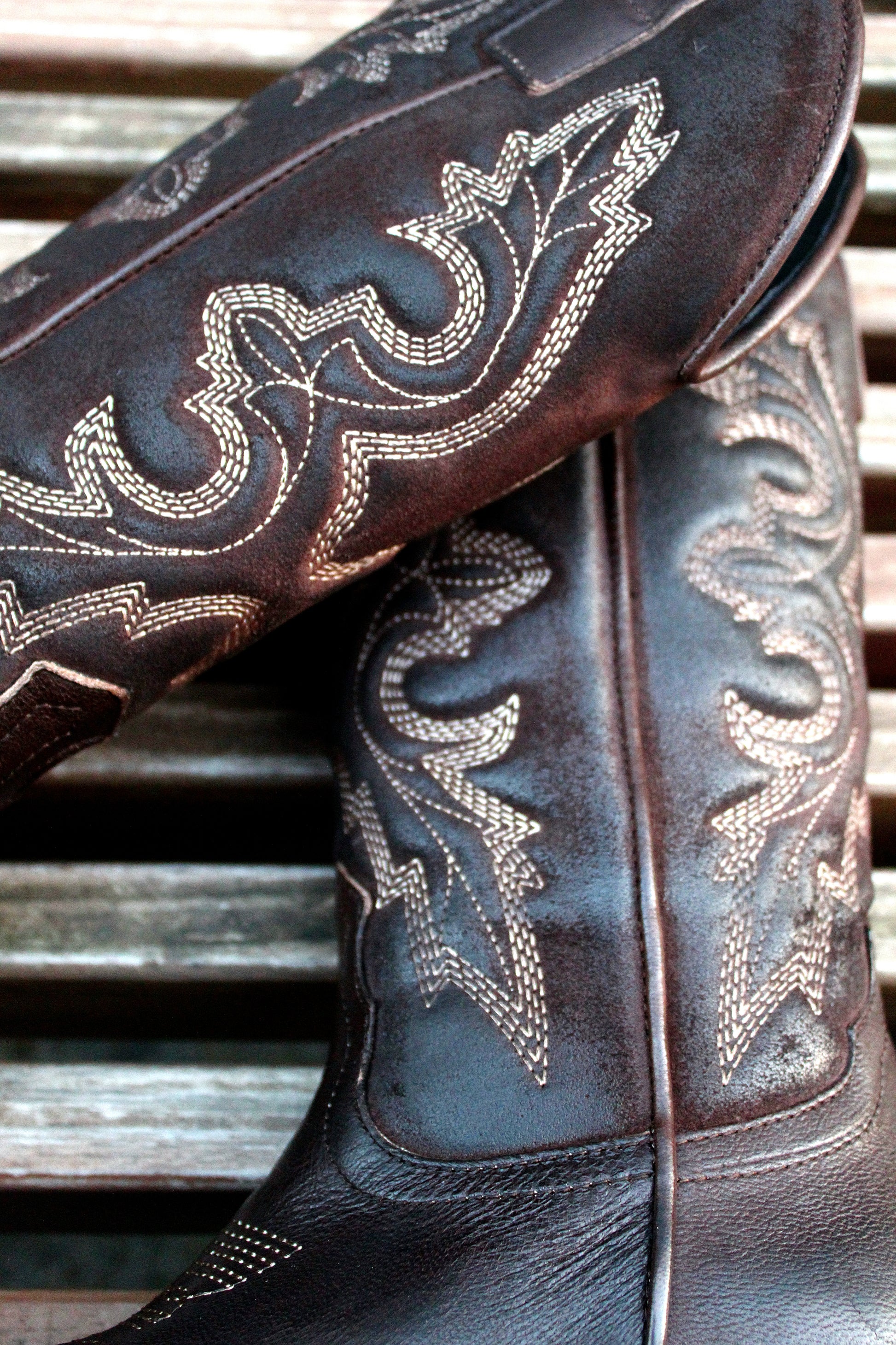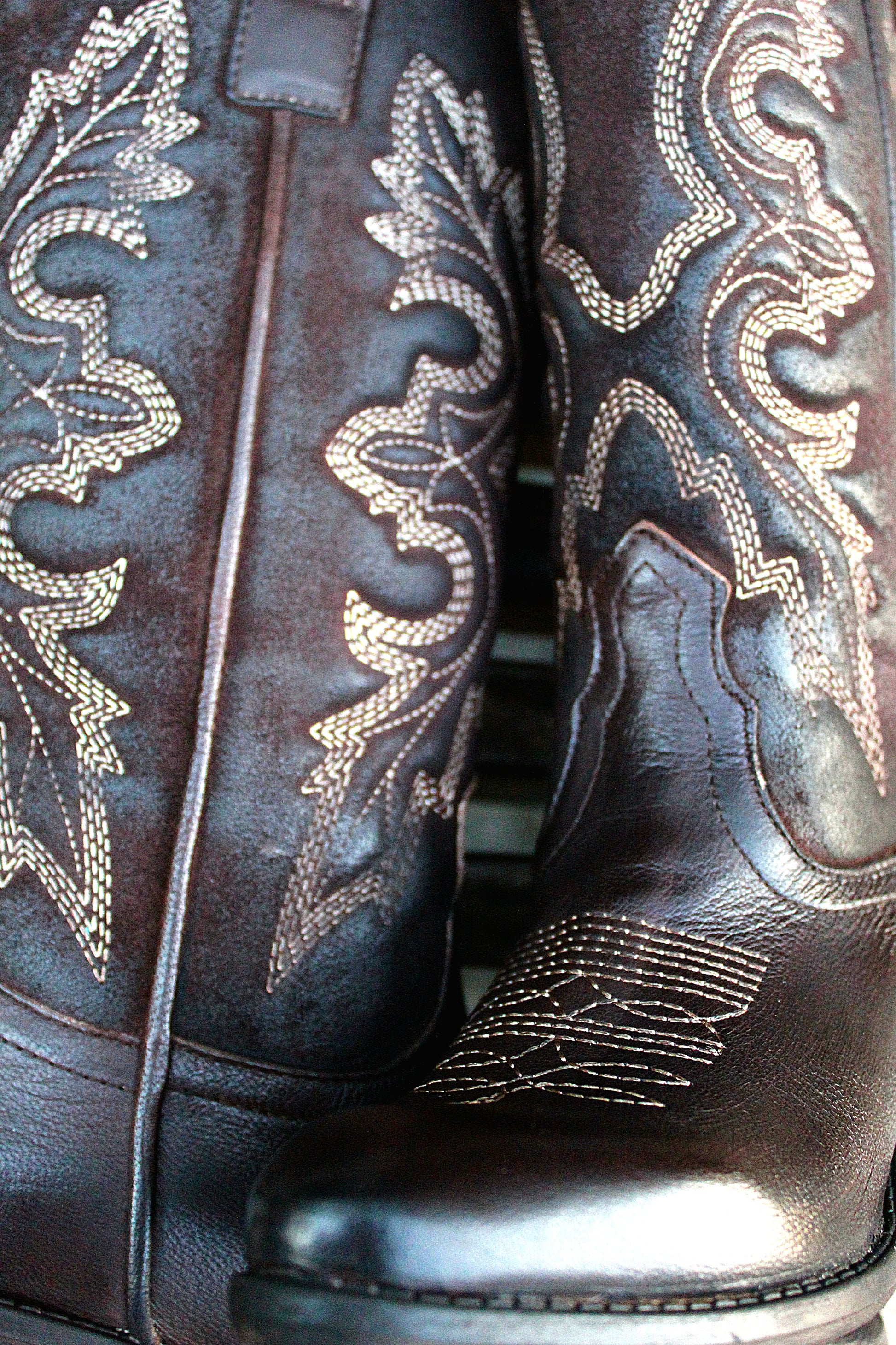 Stivale alto Texano in vera pelle liscia color testa di moro con impunture a contrasto color caffè a classico motivo texano.
