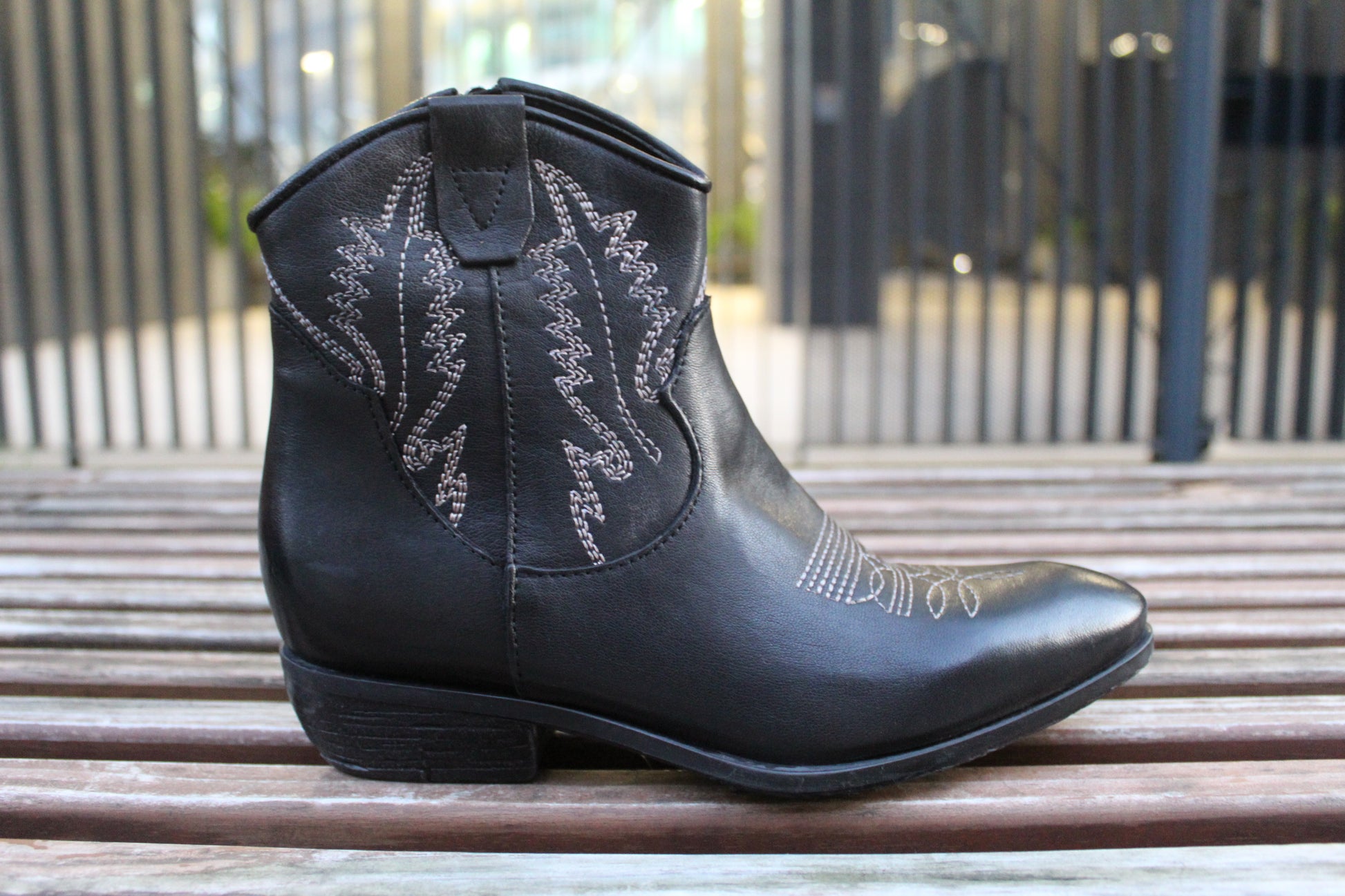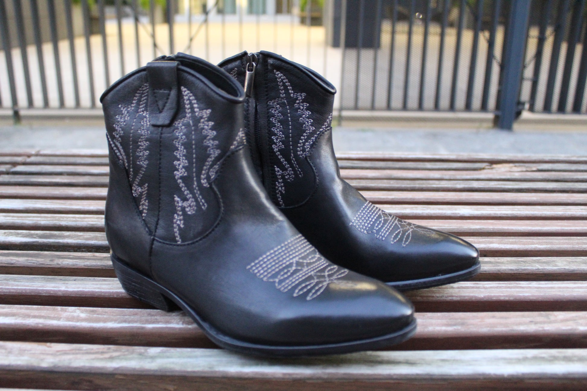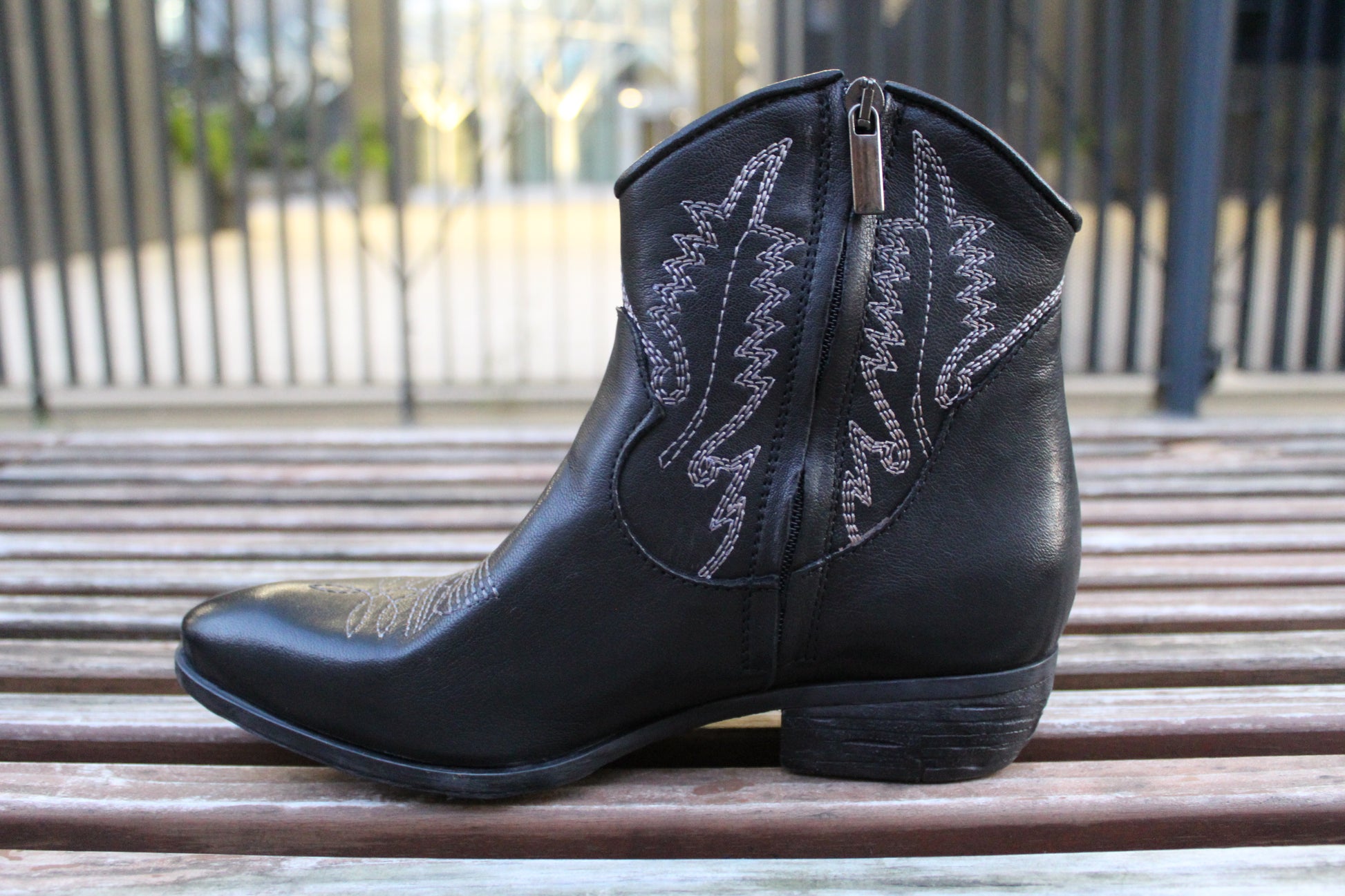 Stivaletto Texano in vera pelle liscia color nero con impunture a contrasto tortora a classico motivo texano.