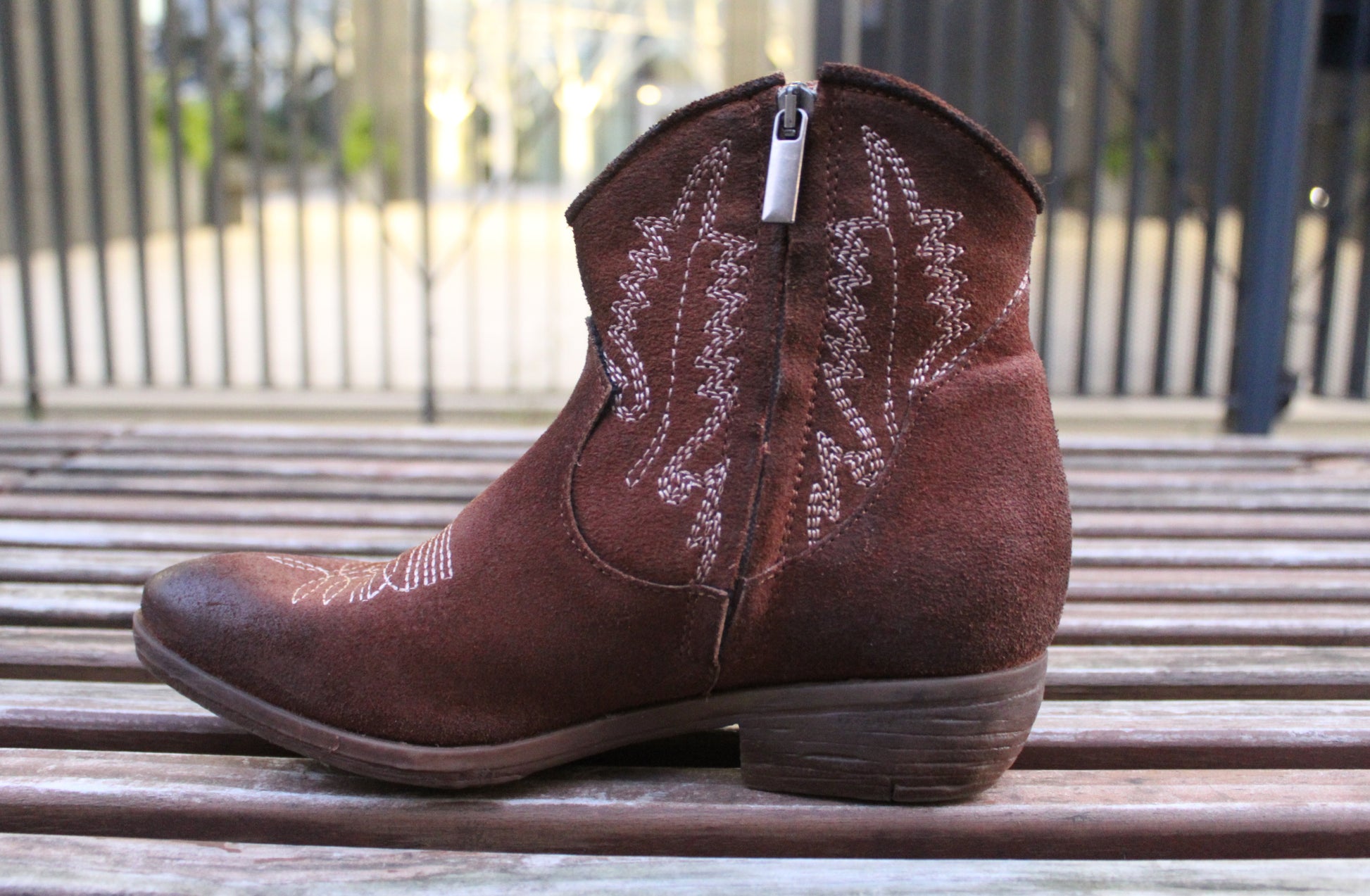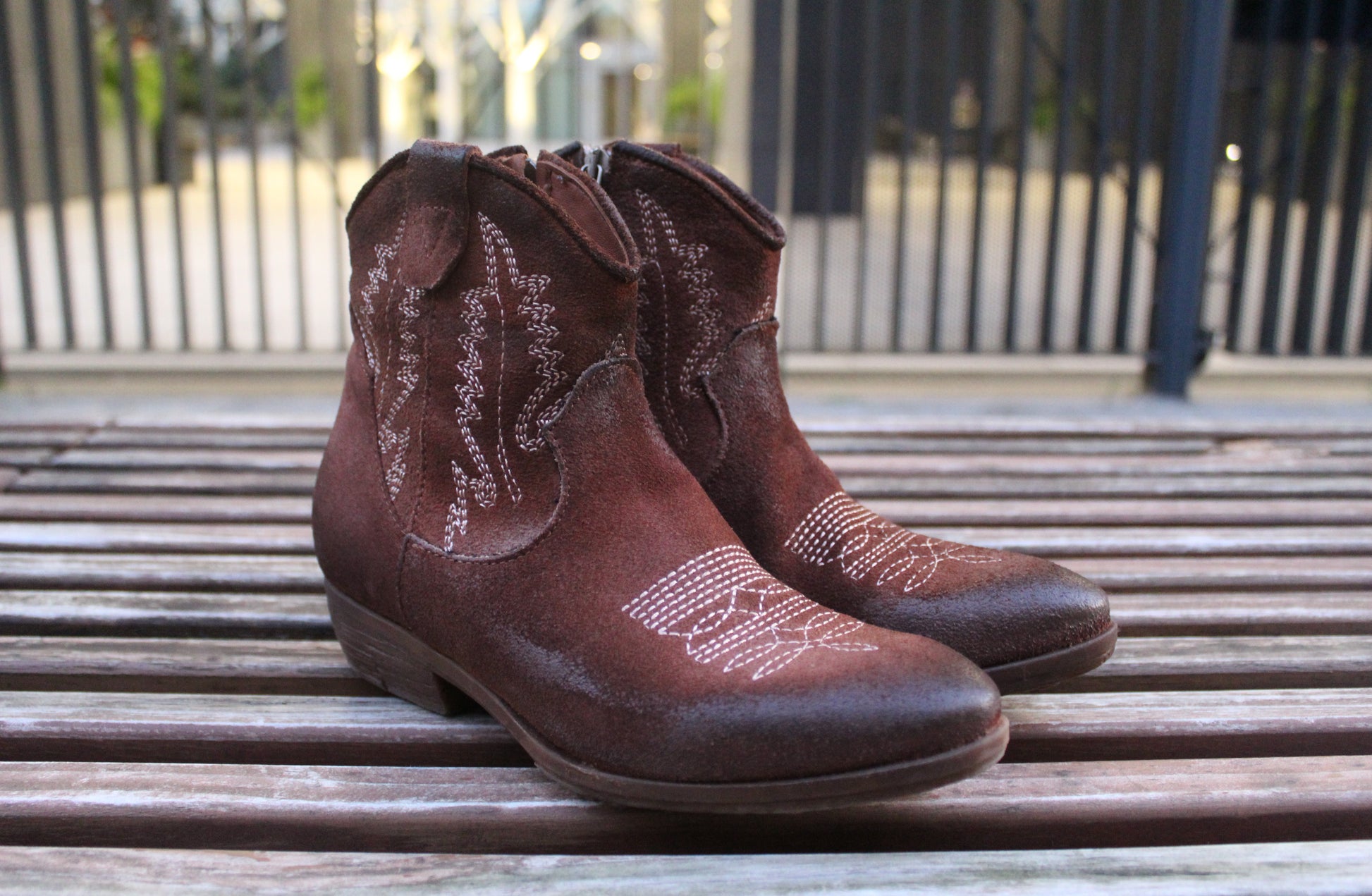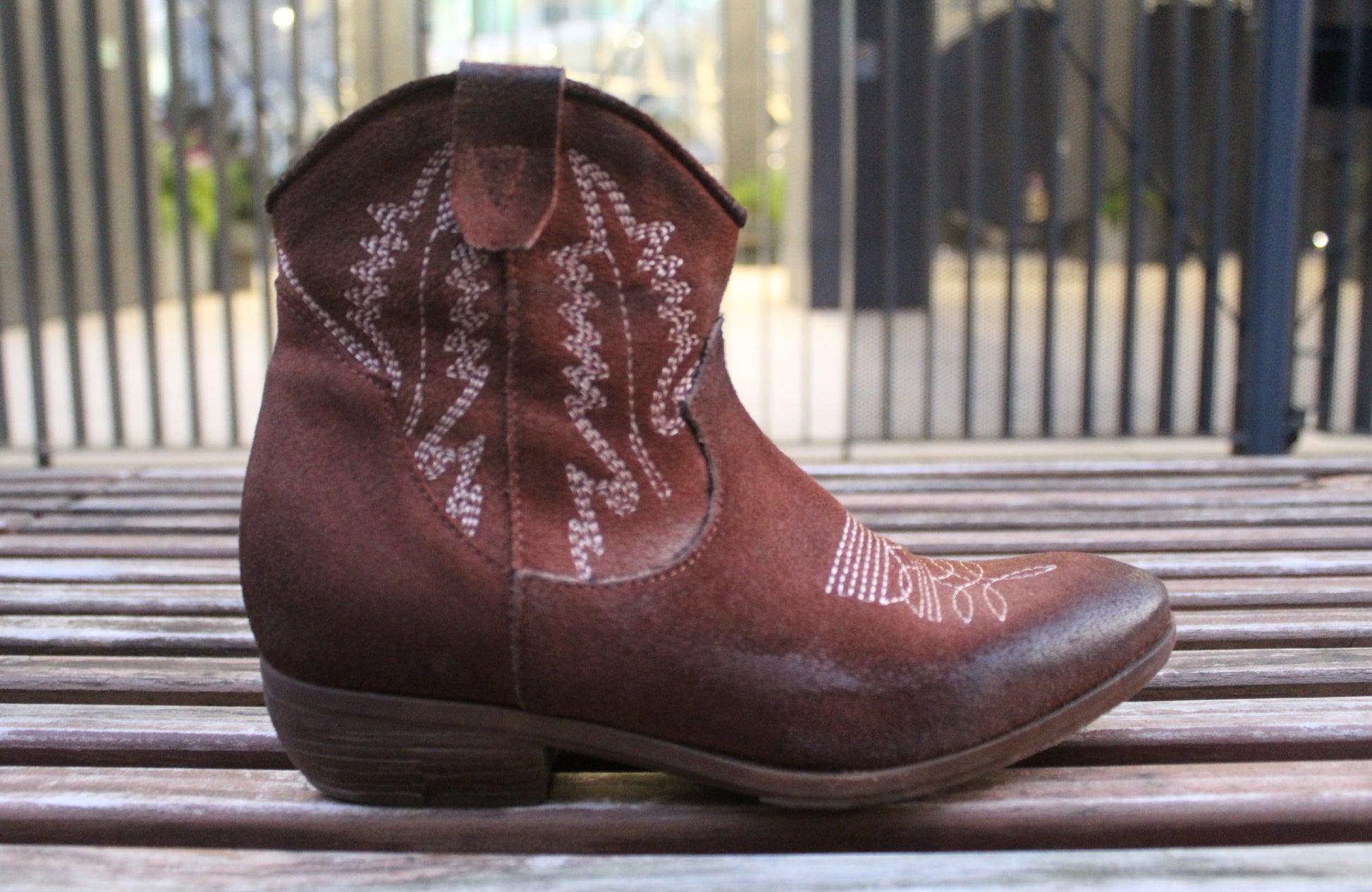 Stivaletto Texano in vera pelle scamosciata color cuoio con impunture a contrasto color tortora a classico motivo texano.