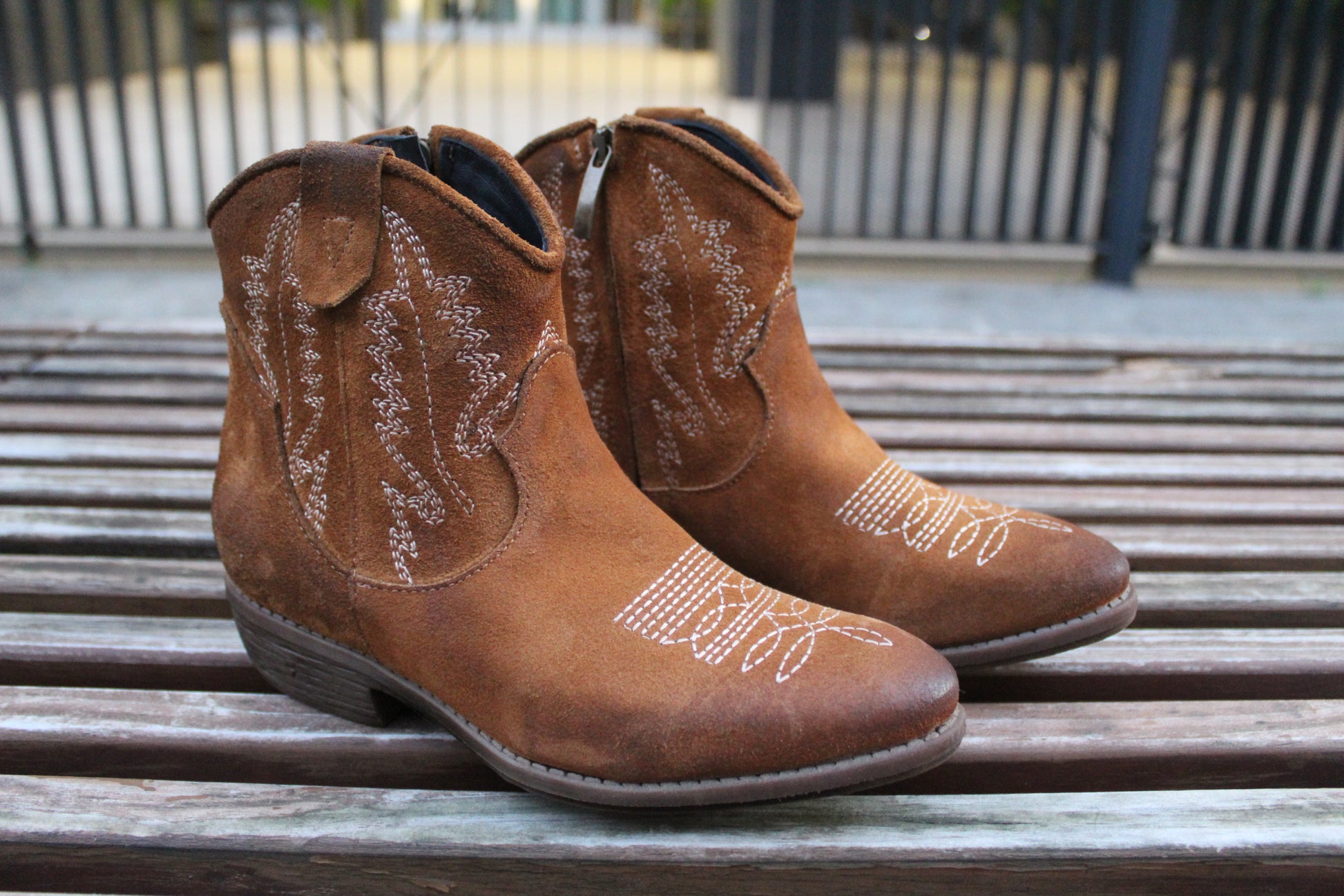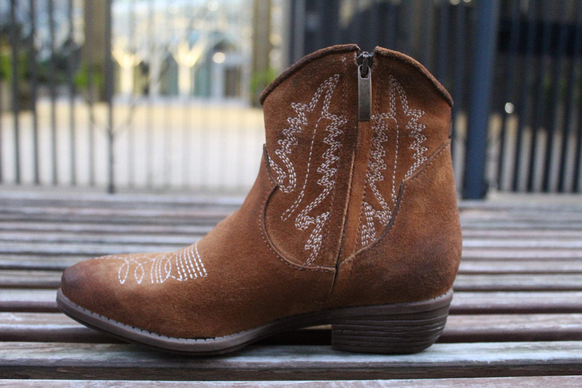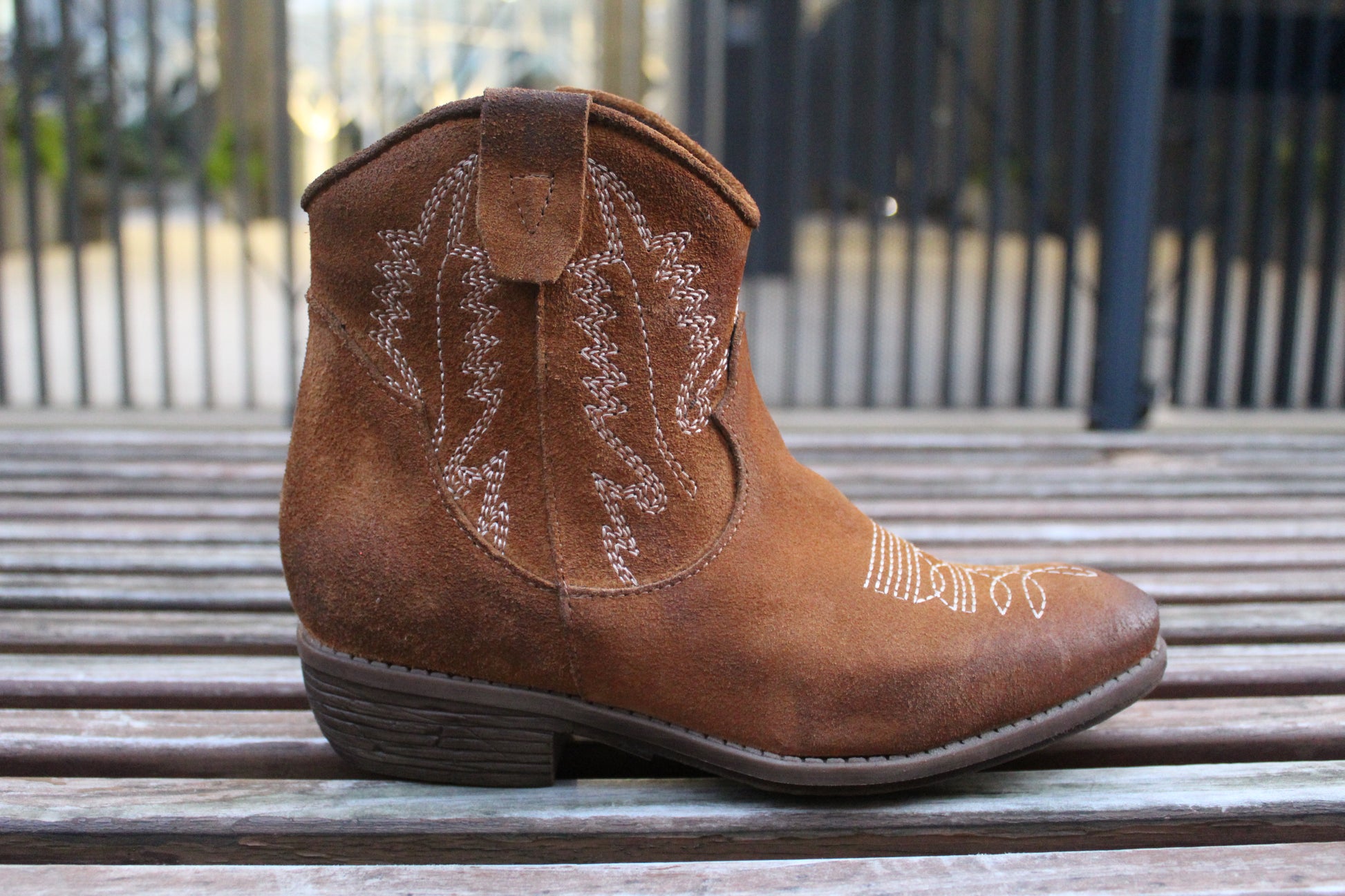 Stivaletto Texano in vera pelle scamosciata color miele con impunture a contrasto color tortora a classico motivo texano.