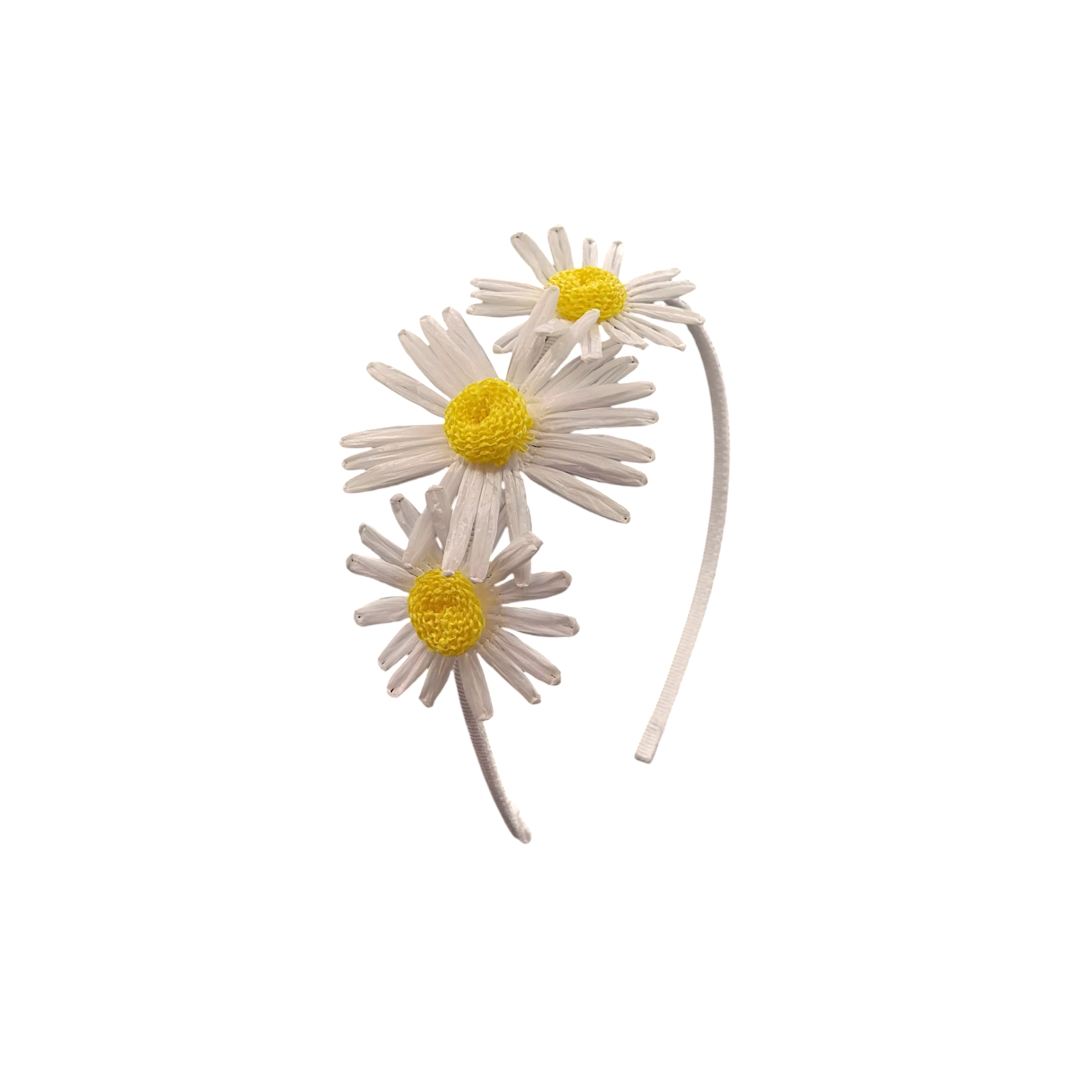 Cerchietto in rafia di 3mm con margherite applicate, realizzato artigianalmente a Firenze.