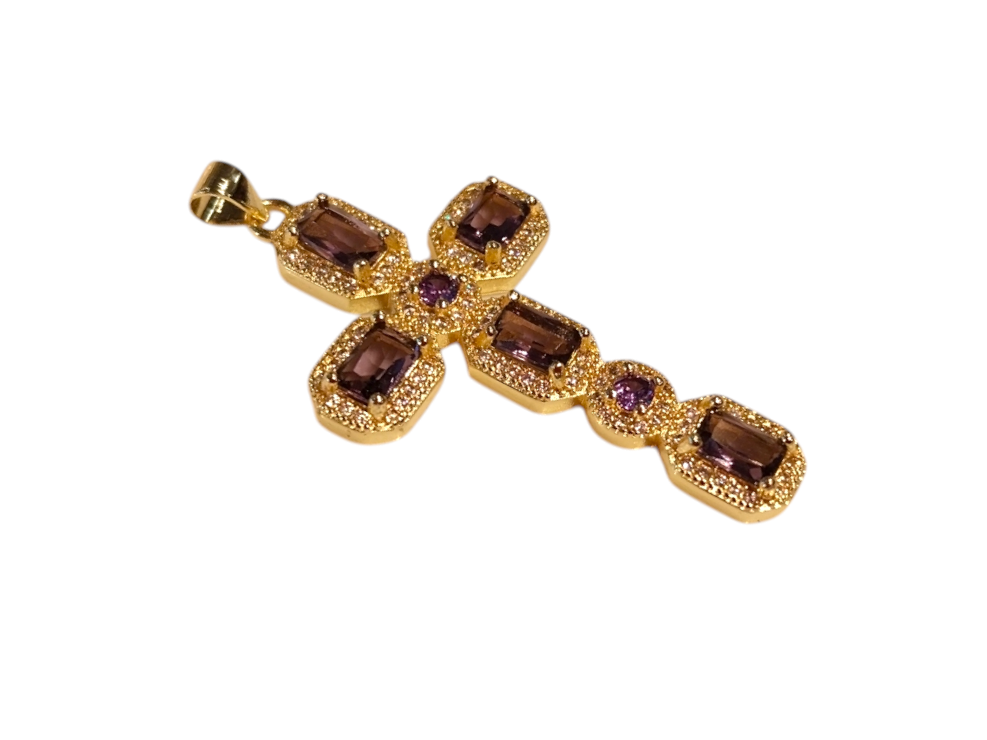 Ciondolo a forma di croce in acciaio inox placcato oro 18k con pietre in cristallo colorato e profili in zircone.