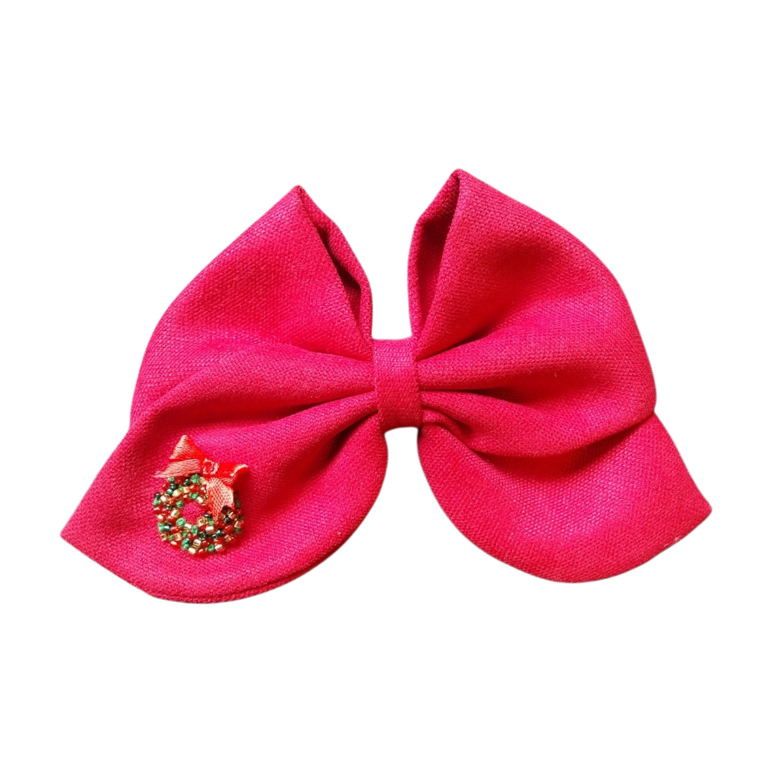 Fiocco per capelli in cotone rosso con bellissimo ricamo Natalizio fatto a mano a tema ghirlanda con molletta a clip sul retro.