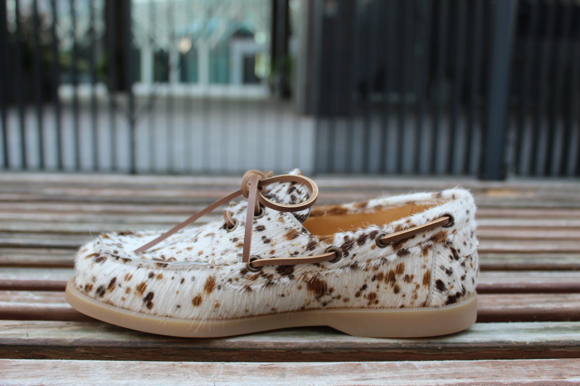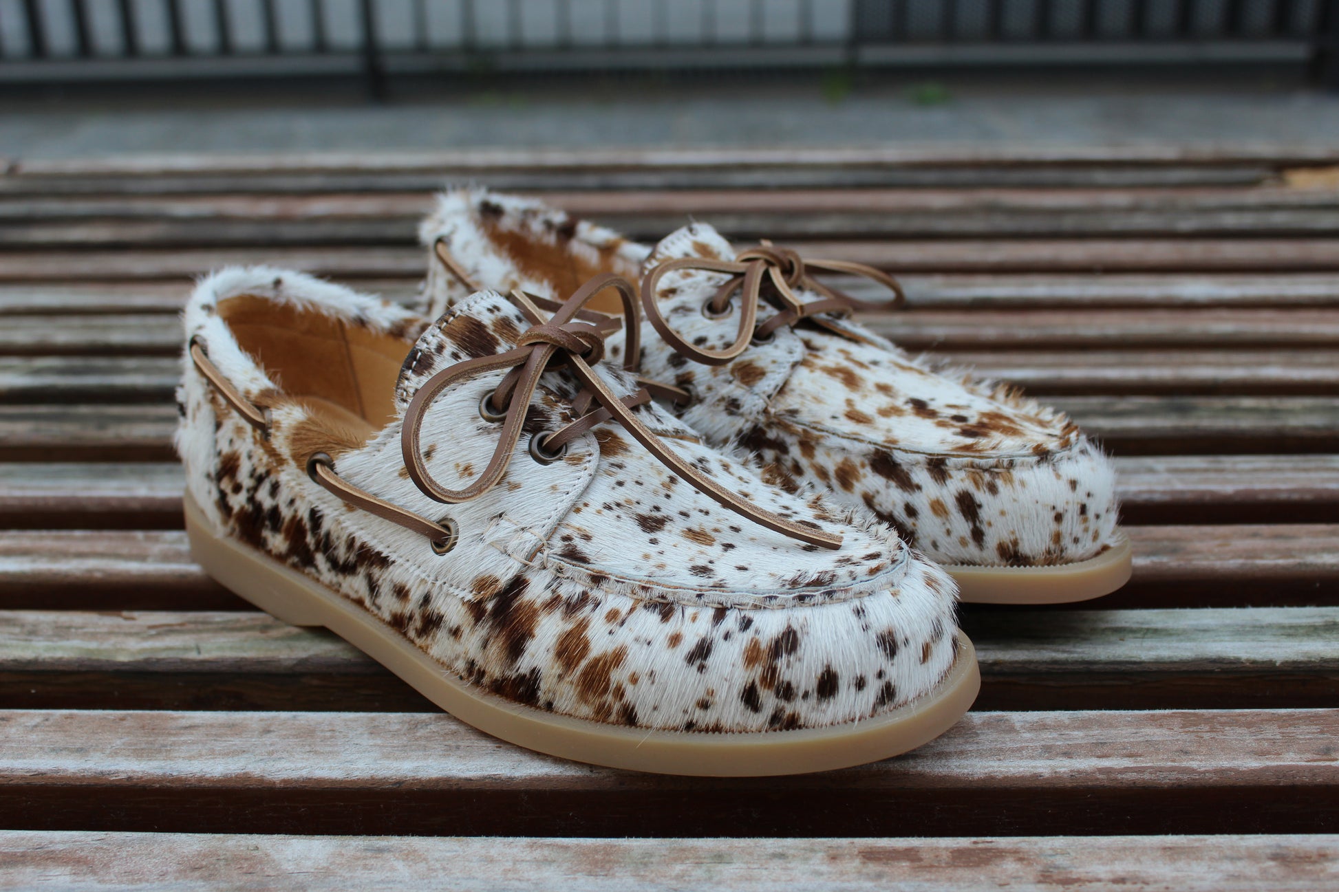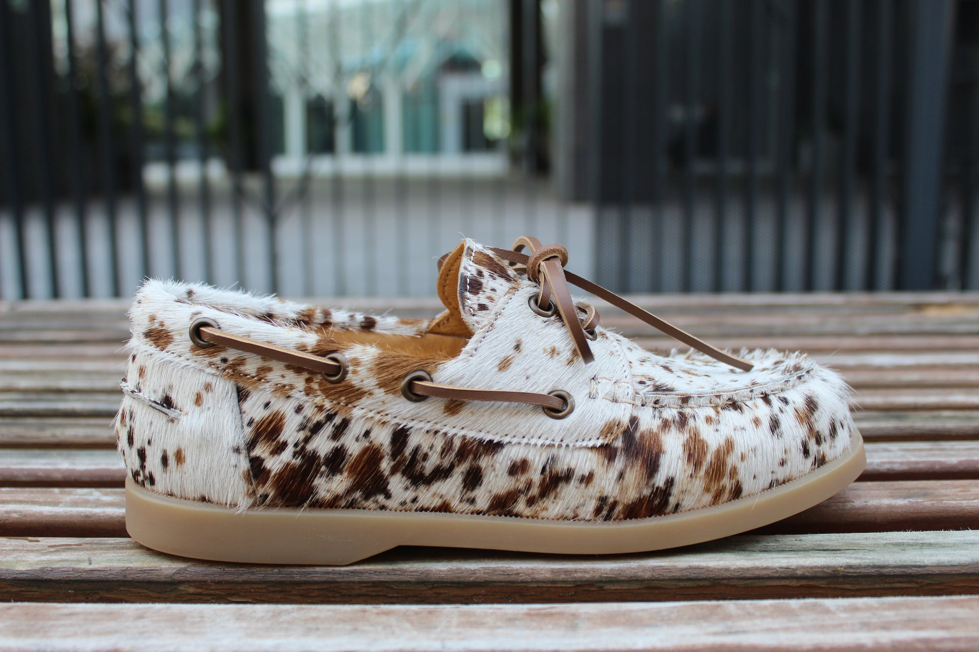 Mocassini modello da barca in vera pelle effetto cavallino fantasia muccata.