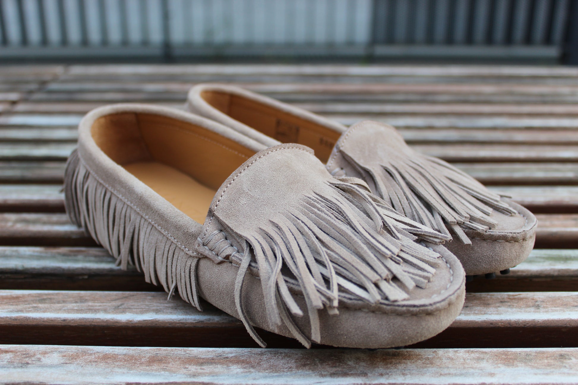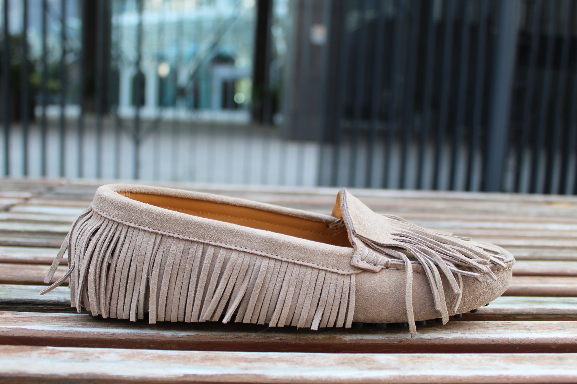 Mocassini scamosciati in vera pelle color sabbia con frange all-over.