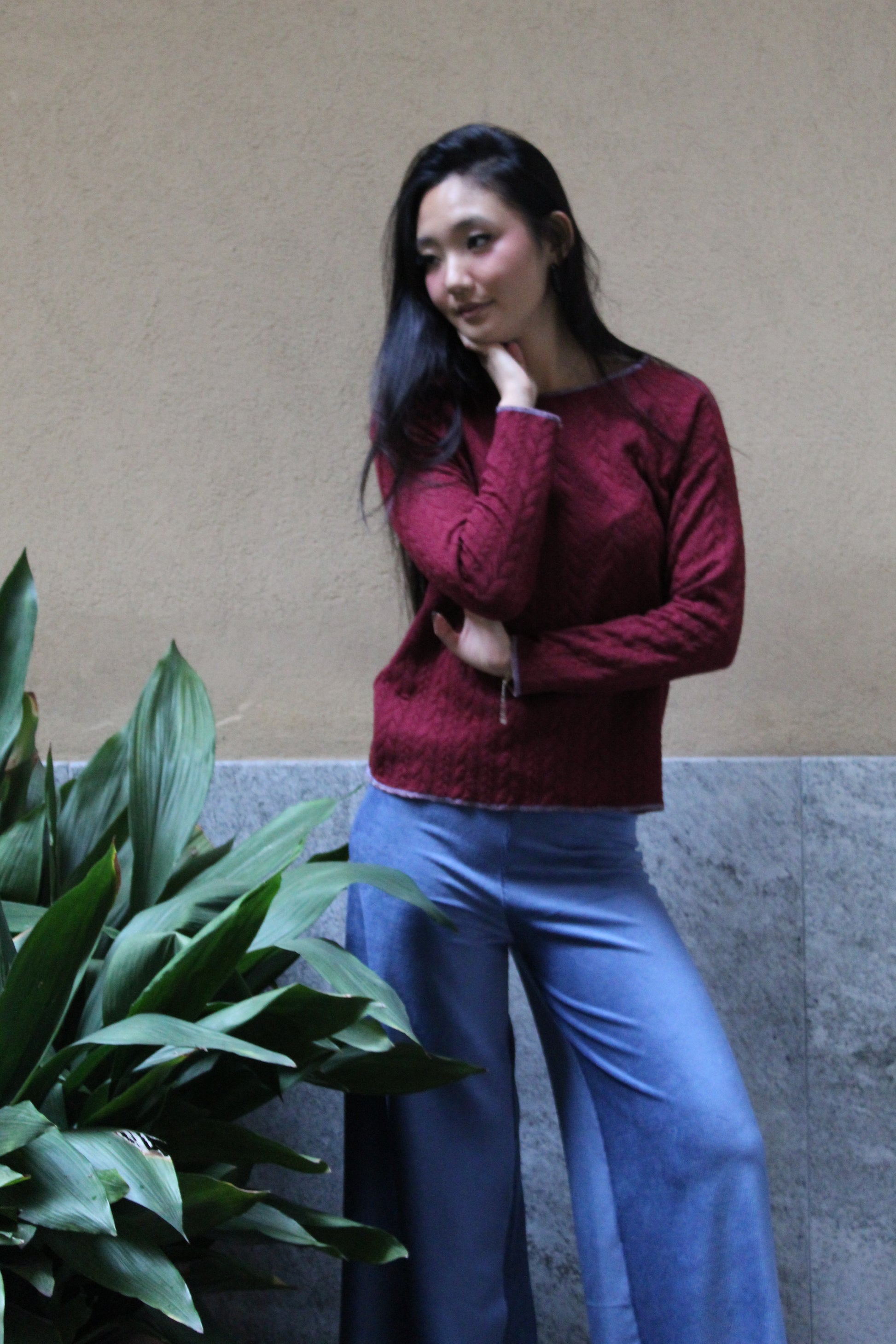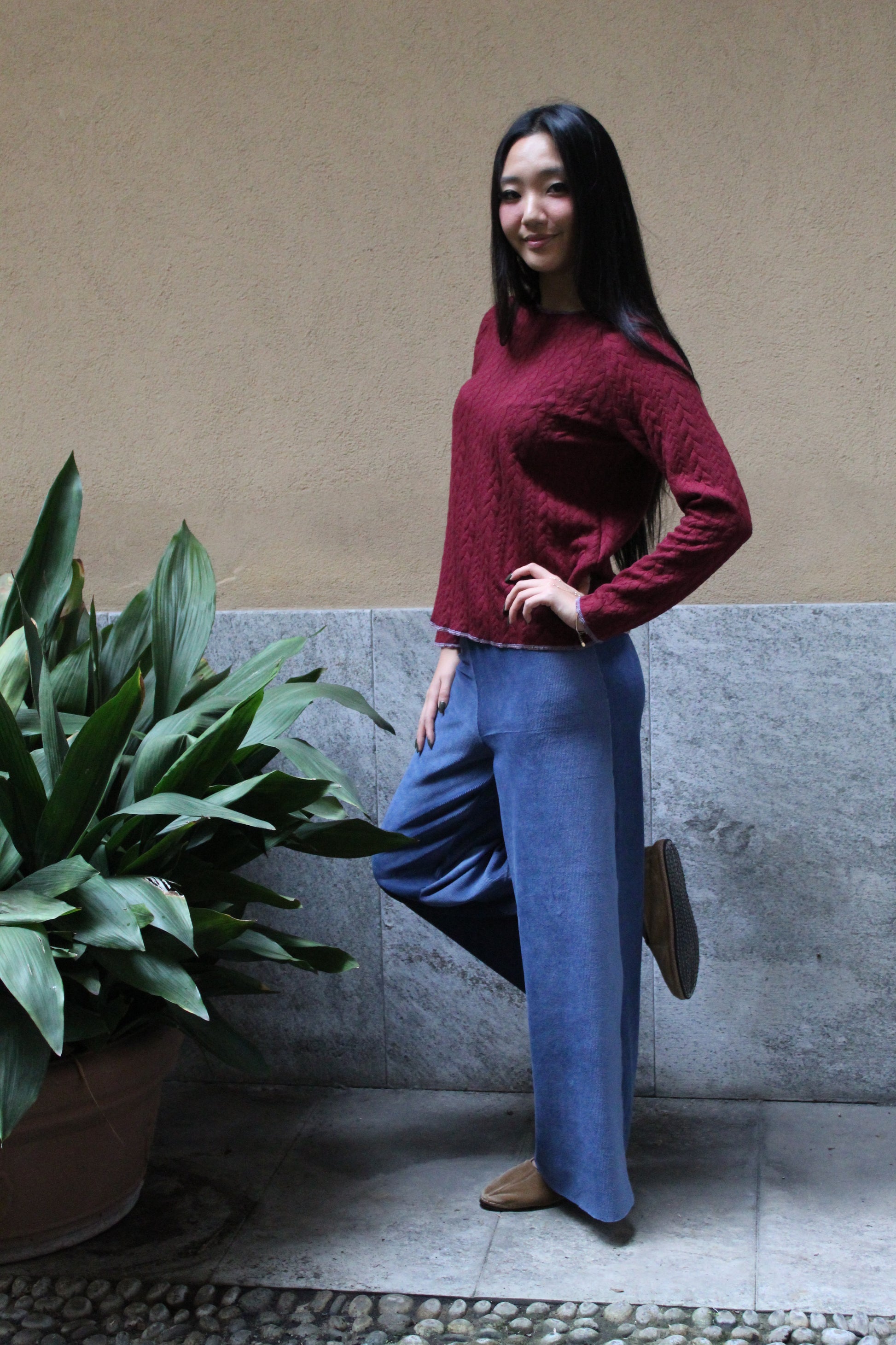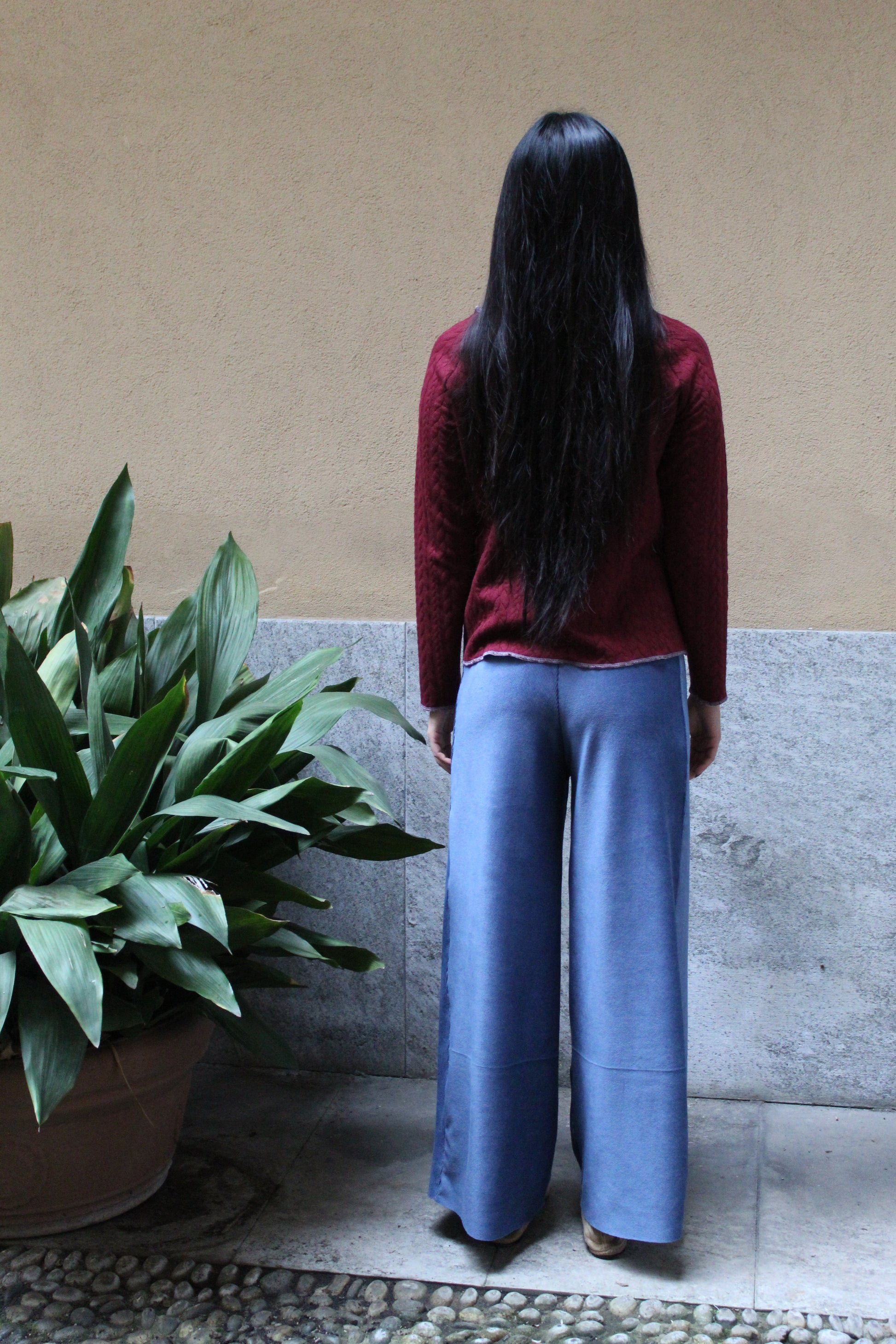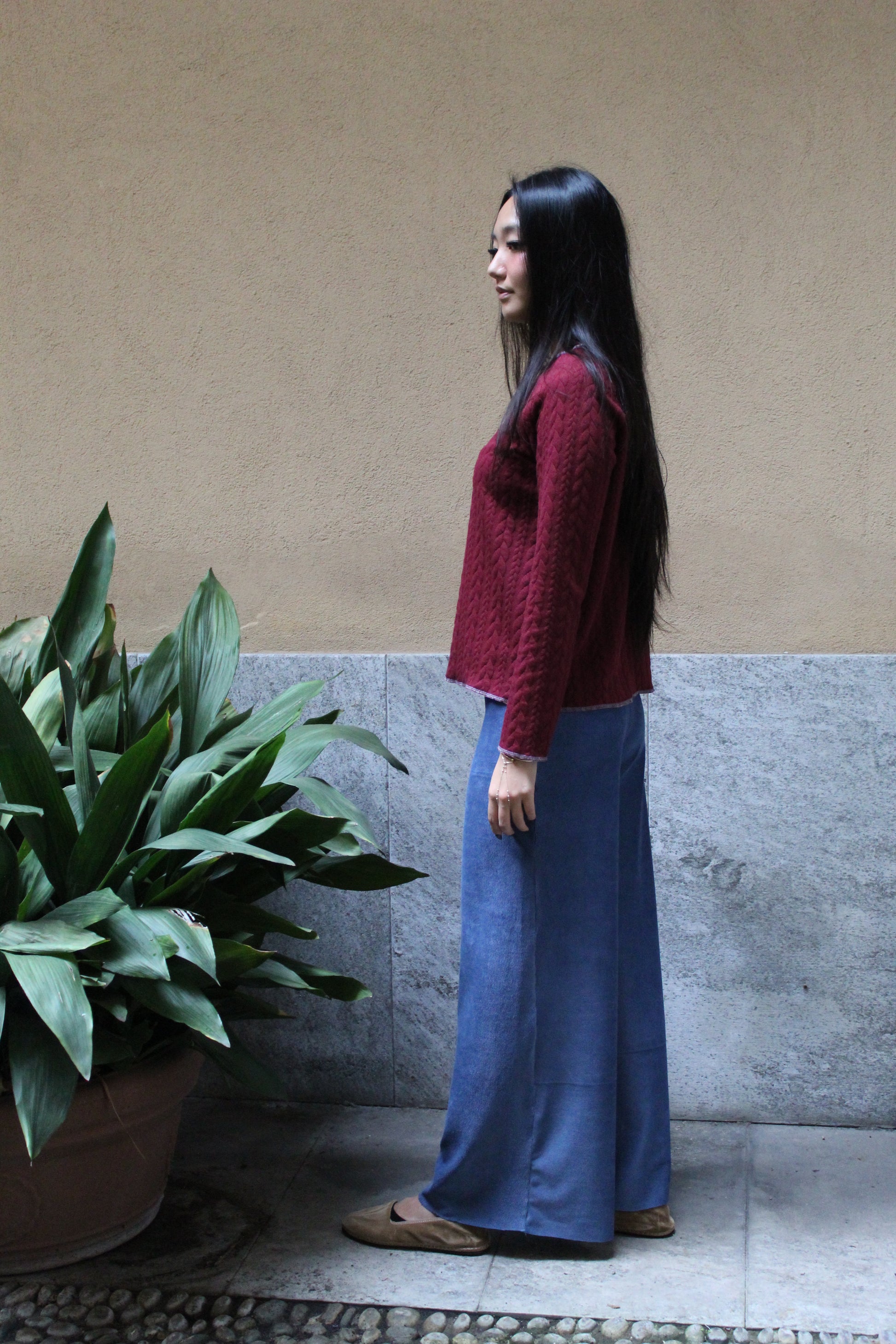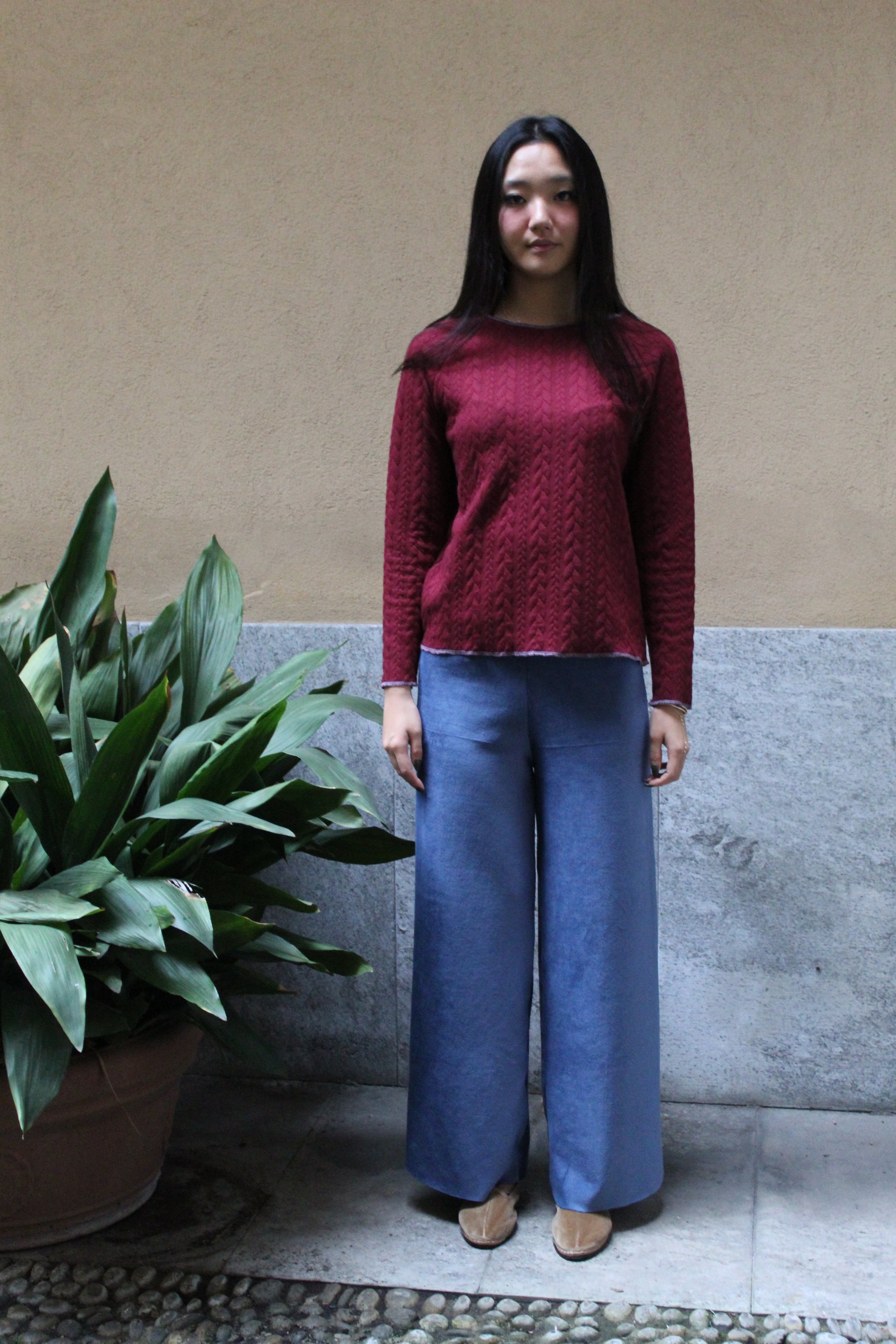 Direttamente dalla nostra sartoria, il nostro modello di pantapalazzo ha una fascia alta in vita, gamba larga leggermente ampia sul fondo per una vestibilità comoda e versatile. Sono realizzati piuttosto lunghi per permettere a seconda dell'altezza di essere tagliati sul fondo su misura. Una volta tagliati non c'è bisogno di fare orli perché il materiale non si sfila e vengono lasciati a taglio vivo.