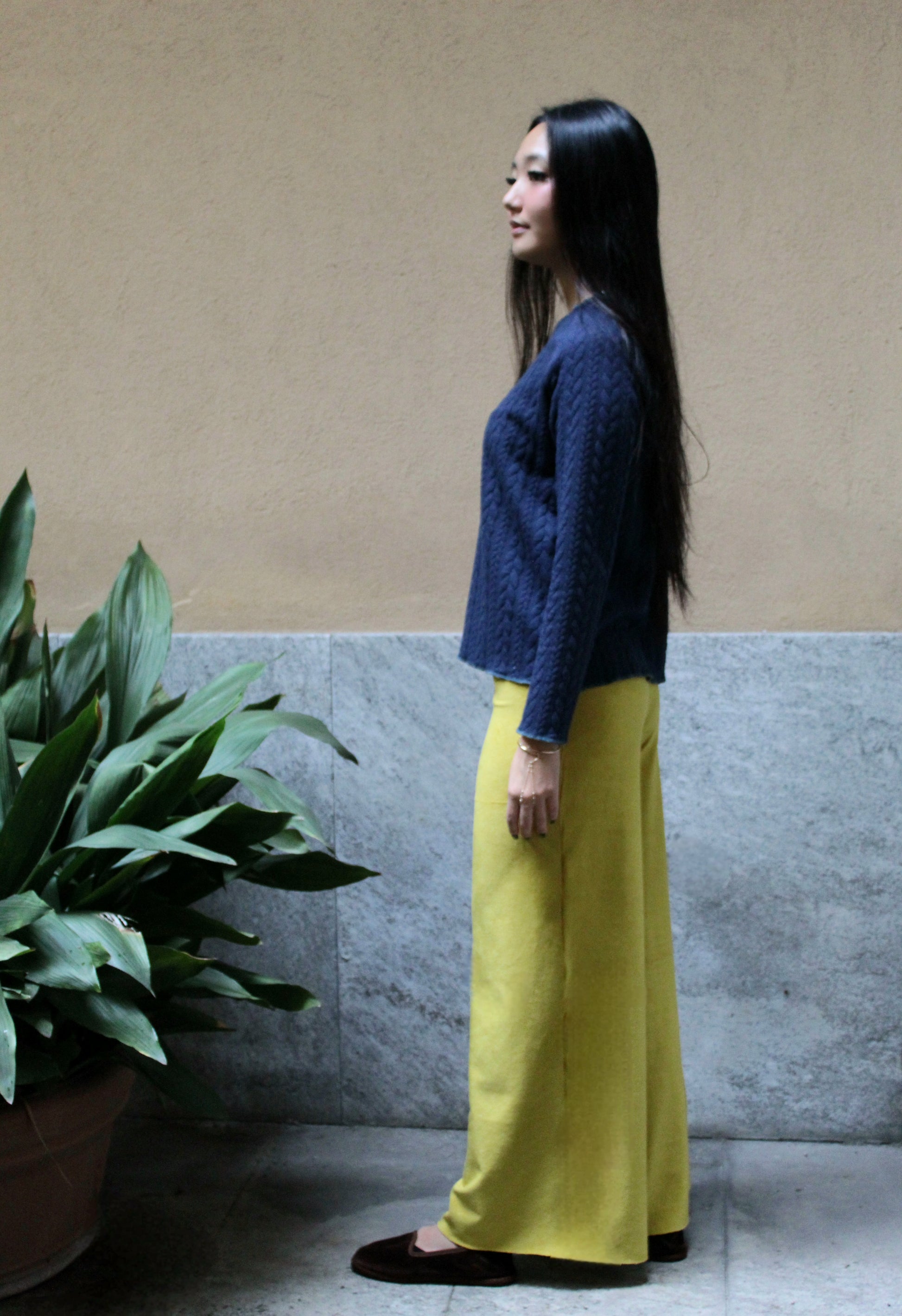 Direttamente dalla nostra sartoria, il nostro modello di pantapalazzo ha una fascia alta in vita, gamba larga leggermente ampia sul fondo per una vestibilità comoda e versatile. Sono realizzati piuttosto lunghi per permettere a seconda dell'altezza di essere tagliati sul fondo su misura. Una volta tagliati non c'è bisogno di fare orli perché il materiale non si sfila e vengono lasciati a taglio vivo.