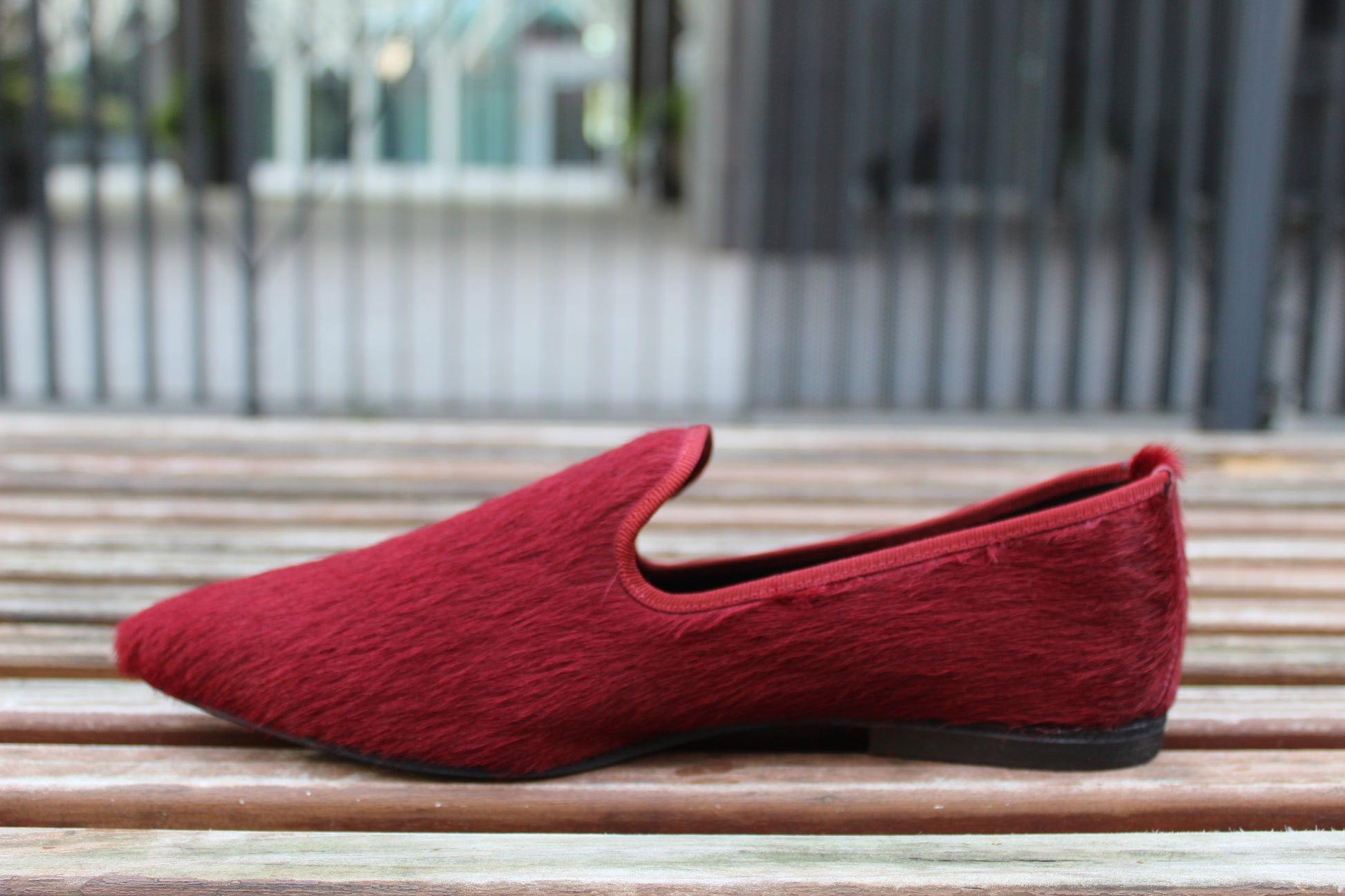 Slippers a punta in vera pelle effetto cavallino color bordeaux.