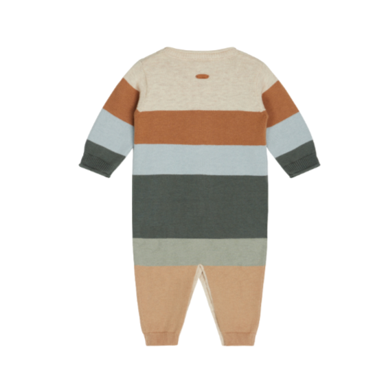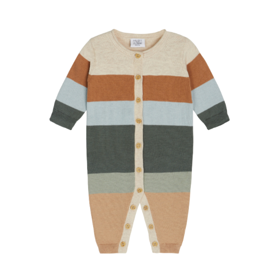 Tuta in cotone a maglia rasata con righe e bordi risvoltati. Bottoni al centro davanti e tra le gambe. Realizzato in 100% cotone biologico.